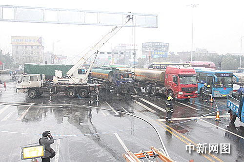 中新网衢州1月6日电(记者 江耘 通讯员 郑时华 陈吉贵)1月6日凌晨3时40分左右,浙江衢州巨化路与46省道交叉路口一辆装载22吨硫酸的槽罐车与一辆大挂车发生刮擦。正当事故正在处理时,一辆大货车从后面撞了上来,将硫酸槽罐车的接口撞坏,导致一吨多硫酸泄漏。