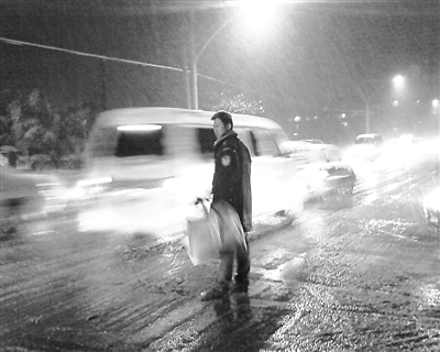 刘红莲女士家住武昌才茂街,在武钢总医院上班。前晚6时下班后,她开车去青山钢花113街母亲家吃饭。路过113街与110街的十字路口,整个路口都被车辆堵死。刘女士发现,马路当中站着一名身穿警服的男子,正在指挥交通,“他一辆车一辆车地疏导,手势十分熟练”。刘女士说,那警察并没有打伞,站在大雪中衣服已湿了好几块。不一会,这名警官来到刘女士车前,要求她将车后退一点,在其指挥下,刘女士右转驶离路口。