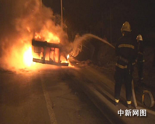 中新网常州一月七日电 (晓陈 朱晓颖)7日凌晨1点50分左右,江苏省常州市新北区机场路上一装有3捆、11吨重铁卷的半挂车在行驶途中突然起火自燃,在勉强行驶一段距离之后,最终侧翻在一个加油站前。为了避免火势蔓延到加油站内,常州消防泰山路中队迅速出动3车、13人赶赴现场处置。经过近40分钟的紧张扑救,大火被成功扑灭。