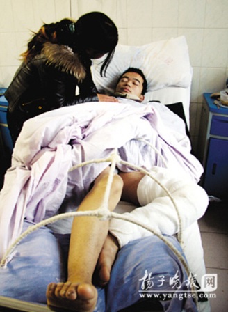 南京市溧水县20岁的小伙子彭洁应聘到上海一家公司,没上一天班却意外遭受了一场灾难,不仅一周时间与家人完全失去联系,而且再出现时已经是面目全非,精神失常,左腿严重烧伤。这段时间内究竟发生了什么事情,由于该小伙目前精神异常,尚不得而知。昨日,记者在南京公安消防医院,采访了彭洁的母亲,她发出悲怆的疑问:我的儿子应聘出去工作怎么变成了这个样子,谁应对此担责?
