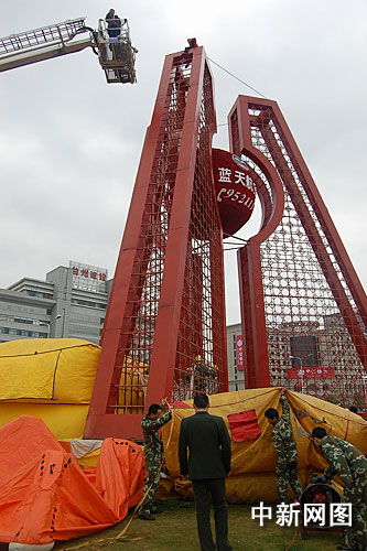 记者在现场看到,一名女子坐在台州市政府门前20多米高的铁制的户外广告牌顶部边缘,摇摇欲坠,一边哭一边擦着眼泪,情绪十分激动,随时准备往下跳,现场气氛异常紧张。