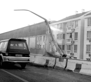 据目击者描述,今晨5时40分许,一辆大型集装箱卡车行驶至卢浦大桥浦东往浦西方向主桥面200米处时,突然发生侧翻,箱体翻倒在地,覆盖了3根车道。桥面右侧的隔音屏被压坏了约10米宽的口子,一根路灯杆已严重倾斜,只剩底部基座与隔离栏相连,摇摇欲坠,路面状况非常糟糕。