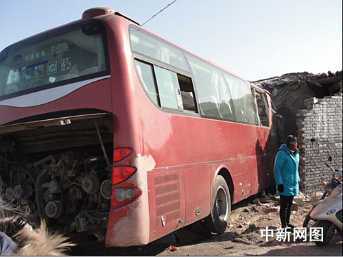 据现场目击者称,大客车是与当地司法部门的小型轿车发生碰撞后,由于车速较快,大客车猛然冲进公路旁的民房内,所幸屋内没人,民房被撞一角严重受损,墙体坍塌。