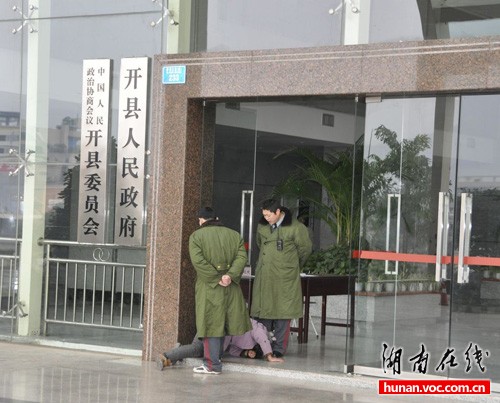 据开县宣传部介绍,1月13日上午9时,网帖中的“半百农妇”——上访户殷先琼背着一红色背包到开县政府大门登记,要求找县里解决相关问题,在县政府门口当值的保安廖富平、朱大国劝殷先琼到县信访办去反映情况,但殷先琼坚持不去,两人随后将殷先琼带上11楼并将情况通报给在11楼的值班人员。截至下午4时许,殷先琼先后在政府11楼过道上和机关综合办公大楼大厅哭闹不止,几经值班人员劝诫无效,严重影响了县级机关的正常秩序。见此状况,廖富平、朱大国随即将其扶到县政府大门外的前台上,殷先琼就跪在地上往里面爬,两人上前劝导,于是就有了网友帖中惹人争议的画面。