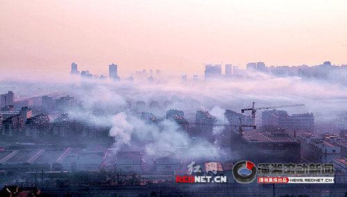 2月21日(大年初八)早上,站在高楼上看高桥大市场方向,整个市场被笼罩在鞭炮的硝烟中,看起来像是海市蜃楼。(图/潇湘晨报读者吴非)