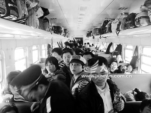 16时30分许,列车停靠在吉安站,等候已久的400余名旅客开始上车。在记者“穿插”途中,听到一个列车员在对刚上车的乘客解释:“只在新干站预留了2节,没想到吉安还有这么多人上车,一节定员118人,现在每节都装满了!大家都挪动一下,排好队上车才快。”