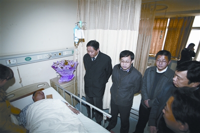 大年初二,在连续工作近一个月后,37岁的江汉区城管执法大队直属六中队队员刘汉桥突发脑溢血。昨日(21日)下午,江汉区委书记张平、区长李强来到协和医院,看望了刘汉桥及妻子,并送去鲜花、慰问金和营养品。