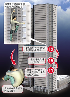 后经民警调查,罗某徒手攀爬到11楼偷了一家住户后,又攀爬到了15楼,拿着15楼住户客厅家的包到16楼的阳台上,翻出包里的现金。之后,罗又攀爬到了19楼,就从此房出门坐电梯下楼。 记者 罗彬
