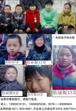 2月18日,天台县三合镇下路王村的蔡修明、蔡修通兄弟家的5名儿童突然失踪。据了解,蔡家兄弟常年在甘肃做生意。过年期间,蔡家兄弟带儿女们回老家过年。2月18日14时许,蔡修通13岁的女儿蔡亚妮带着3个亲姐弟及蔡修明的小儿子蔡松涛,去1公里外的同谊村找同学玩。一小时后,蔡亚妮的母亲发现找不到女儿了。随即,蔡家人发动全村亲友寻找。但村民两百余人遍寻周边村庄、山上、湖泊都未找到。