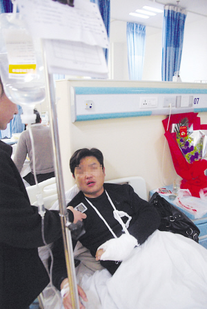 记者走进常州市第一医院见到了这位勇敢的司机。受伤司机叫王雷,今年29岁,他在公交系统工作了8年,再过3个月,就要满6年驾龄了。采访时,王雷躺在病床上输液,被刺伤的左手被纱布包扎着。他说,“疼是肯定的,但是也还好,不是太严重。”