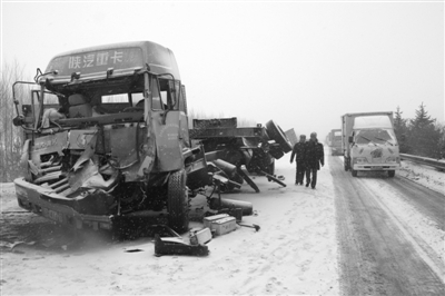 就在记者到达事故现场时,一辆肇事大客车正开离现场。据司机介绍,客车发生事故的时间是在清晨5时许,当时他发现前方有事故车辆,由于路面较滑,追尾到前方事故车辆,随后又造成后面几台车连环追尾。