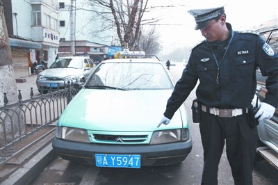 昨日下午3:30分左右,在利济路岗执勤的硚口交通大队民警段智迪,发现一辆车牌为鄂AY5947的出租车牌照有假,立刻上前拦停,不料司机却加速驶离,他立刻电台通知前方民警拦截。