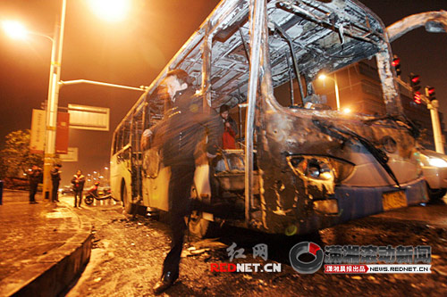 下午7时许,潇湘晨报滚动新闻记者赶到现场,一辆车牌号为湘A13646的公交车停在路边,大火已被赶来的消防队员扑灭。
