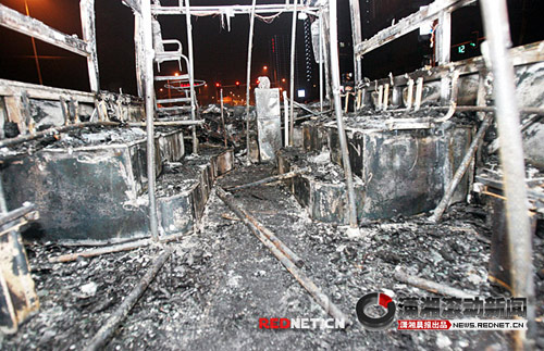 公交车被烧成了一个铁架子,地上满是烧碎的玻璃渣子和零部件,车内一片狼藉,完全被烧毁。