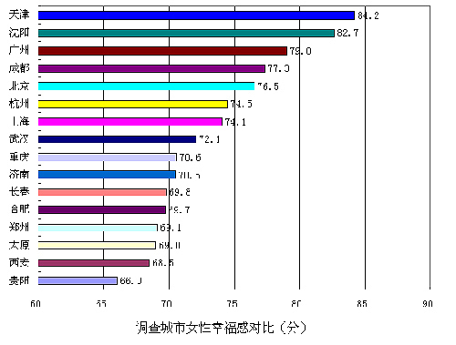 据了解,今年年初,北京一家专业民意调查机构在北京、上海、天津、重庆、沈阳、长春、济南、郑州、武汉、杭州、合肥等16个中心城市,对1760名年龄16~70岁之间的城市女性,就幸福感及影响因素进行了系统抽样调查,并发布《都市女性幸福感调查报告》。在16个城市得分中,天津女性的幸福感最强,达84.2分;其次为沈阳女性,幸福感为82.7分。合肥以67.9分排名第12位。