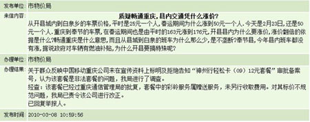 市民在公开邮箱中明确反映,春运期间,由开县城内往返白泉乡的车票价格从平日的25元涨至50元,疯狂涨价不知依据为何?让人忍俊不禁的是,市物价局的回复围绕着一条对通讯行业投诉的展开,答非所问。