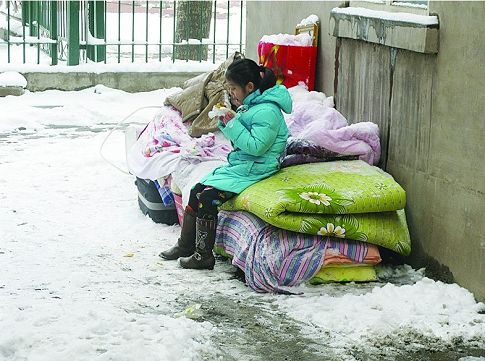 当日中午11时许,女孩的母亲回来了,给女孩带来了一个烧饼作为午饭。记者询问女孩母亲为什么住在外面,这位女士只说,与房东发生纠纷,目前已经找到房子,随后又骑自行车离去。直到再也看不见母亲的背影,女孩才独自坐到了潮湿的被褥上,在风雪中低头默默地干啃着烧饼。 (燕赵都市报 记者 刘涛 实习生 郭斌)