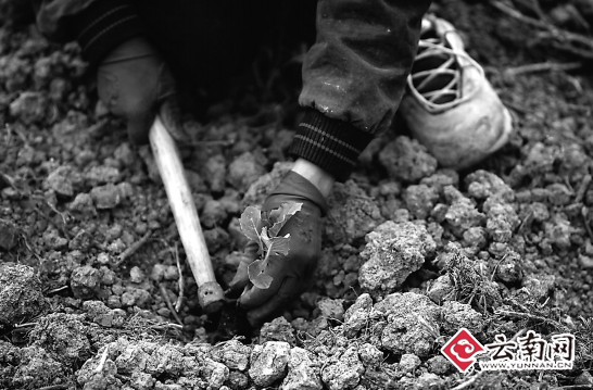 在呈贡县大渔乡,60岁的李国荣一家正在忙着种菜,媳妇前面分青菜苗,自己忙着种菜,儿子则抬来发电机抽水,他乐呵呵地说:“天终于阴了,还飞了几颗雨,真是救命啊!”他从小长这么大,从来没有遇到这样大的干旱,从去年到现在,他们家已经三季没有种菜了,第一二季的菜苗都育好了,就是种不下去。