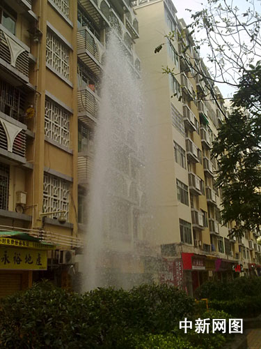 中新网广州3月11日电(吴敏平)“我还没有在街上看到过喷得这么高的水柱呢!”水柱一跃4层楼高,一位路过广州应元路的市民不禁惊叹。难道在住宅区附近新建了一个大型喷水池?原来是由于工人在进行通信线路抢修的时候施工不慎,凿掉了自来水管零件,才造成了“喷泉”从应元路旁喷涌而出的景象。