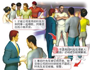 王某事后证实,约叶先生吃饭、嫖娼,都是他们事先设下的圈套,解救自然也是假戏。目的就是以刚聘用的员工犯错误为由将其开除,然后扣钱。据介绍,该公司还有一种行骗方式:让应聘者到外地收账,故意安排一些高风险工作。如对方不愿意,就让他自己写辞职信。