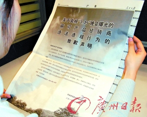 翻开昨天的《人民日报》A16版,一整版的《关于央视“3.15”晚会曝光的丽可产品经销商违法违规行为的致歉声明》赫然入目,公司在声明中表示:“对公司的经销商在其经营活动中发生的上述违法违规行为,向全国消费者表示真诚的道歉!目前公司已经取消了上述经销商的产品销售资格,并将视情况对其采取进一步的法律措施。同时,我公司将深刻吸取这次事件的教训,加大对经销商队伍的培训和整顿力度,坚决淘汰那些违法违规不负责任的经销商,以崭新的面貌给消费者提供更优质的服务。”
