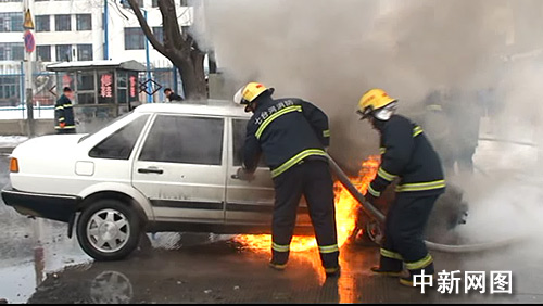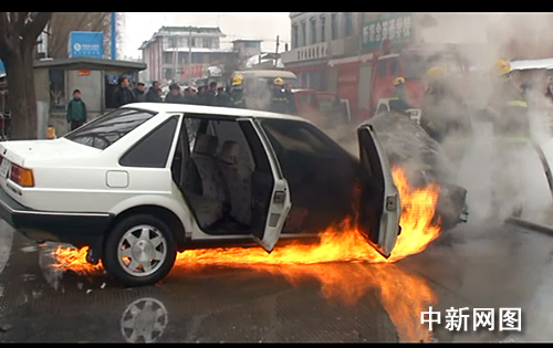 中新网七台河3月20日电 今天7时20分,在黑龙江省七台河市勃利县长安街上一辆白色桑塔纳轿车发生自燃,火势猛烈燃烧并冒出滚滚浓烟,勃利县消防大队消防官兵赶赴现场将火扑灭。