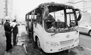 昨日17 时许,记者在现场看到,这辆蓝色中巴车底盘以上部分几乎全被烧毁:方向盘和所有的座椅烧得只剩下了钢管,汽车仪表盘、车顶日光灯、空调设备和电视机也烧没了,四周的车窗玻璃全碎了,车厢内和马路上到处都是灰烬和玻璃碎片。当时,大火已经被消防人员扑灭,消防技术人员正在车内拆开线路察看。联盟路派出所 “110”1号车民警也在现场维持秩序。