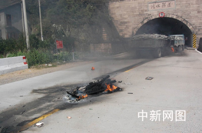 在消防员赶到现场后看到,那辆满载有水泥的挂车斜着横在马路上,堵住了隧道口。顺着一条10来米的刹车印,在挂车的后方一辆被撞得变了形的男式摩托车正燃着熊熊大火。