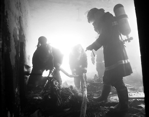 记者沿楼梯爬上15楼,看到着火的这家房间内的衣柜等家具已经被大火烧毁,被褥、衣服也都烧成残片。此时,房间内明火已经被扑灭,但浓烟弥漫,气味刺鼻,消防人员头戴防毒面罩、身背氧气瓶正在搜寻容易复燃的东西。