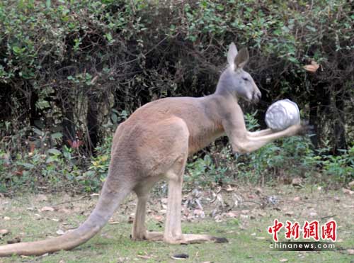中新网武汉3月30日电 (何志华 徐金波)武汉动物园饲养的一只赤大袋鼠近期学会了向饲养员讨饭,当它饿了或是渴了时,就会用前肢夹起饭碗伸向饲养员,表达自己的心愿。