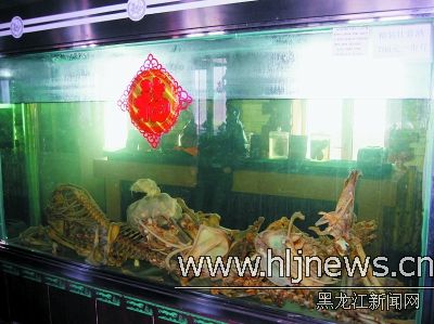 在这个柜对面是个同样大小的玻璃陈列柜,里面满满一缸白酒泡着一堆“动物骨骼”。据说,一个月前这副骨架还是完整的,不知何时被人打散了。酒缸的右上角贴着醒目的价签“精装壮骨酒780元一市斤”。