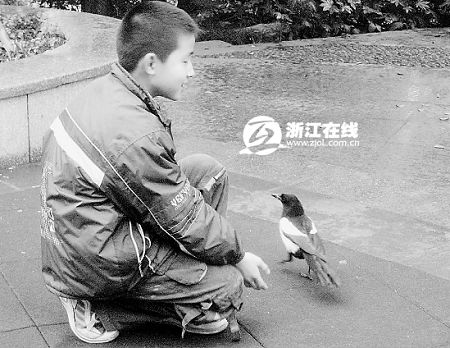 前天,他和爸爸妈妈一起到家附近的半山公园玩。中午12点多,他们来到半山腰的翠峰阁,突然飞来一只喜鹊,代妈妈顺手用相机给聚林和喜鹊合了张影。可没想到,拍完照,喜鹊竟然不肯走了,整个下午,喜鹊就围着代聚林转。