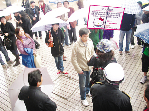 昨天,虽然雨一直下个不停,但观前街上依旧人流如潮。下午两点多,突然在观前街西侧入口处的食品商场门外的步行街上,出现了一位一身便装的青年女性。在雨中,她举起了一张“征人吃饭”牌子,当即就引起众多市民和游客的围观。