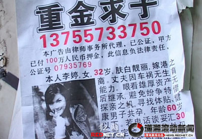 记者在蔡伦中路电线杆上发现一份重金求子的广告。广告上附着一张年轻女子的照片,女子自称陈丹,身高、皮肤相貌样样具好,去年丈夫意外致残失去生育能力,为继承庞大家业,特寻异地健康男士为丈夫求子。