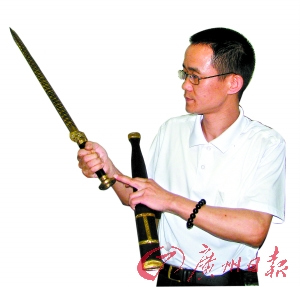 今年37岁的陈再荣是湖南人,2006年,他来到台山市,以开铁艺店为生。“从小我就爱看武侠小说,对剑更是喜爱至极。那时候家里穷,没钱买玩具,我都是用竹子和木头削成剑来当玩具。前两年回老家盖房子,我还找到了一把自己20多年前削的木剑。”他说。