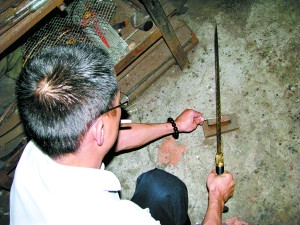 陈再荣:我没有后悔过,只是有时候因为实在没钱,只好暂时停下来。这些年来,我买了不少关于铸剑方面的书自学铸剑术,也看了不少与剑有关的文章。读这些书,使我明白,剑是一种精神,是一个人的魂。(严建广)