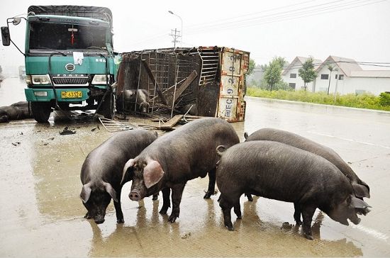 押车人老王告诉记者,他们是从漳州过来的,准备把猪载到安溪屠宰,当车子开到这一路段时,突然一辆小轿车从旁边小路开出来,货车司机急忙刹车,因为雨天路滑,车子发生侧翻,并撞上了从另一个方向开来的大货车。老王说,车侧翻后,二十多头猪都跑了出来,有的在国道上“撒欢”,有的窜进了旁边的小路。