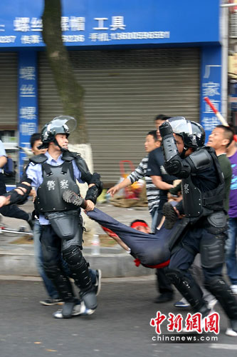为安抚砍人男子的情绪,现场特警便装上前与其交涉,但交涉无果。随后,让人意想不到的事情发生了:男子突然举起肉刀用力地砍向自己的头部,连砍四五下,顿时鲜血四溅。特警见状迅速上前将男子制服。随后,该男子被送往医院抢救。