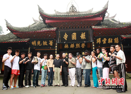 中新网乐山5月5日电(记者刘忠俊)5日,四川峨眉山景区,迎来了参加“决战峨眉之巅”洲际拳王争霸赛的七名拳手。在报国寺一山亭,拳王们亮肌肉、秀拳脚,令现场的游客连连惊叹。