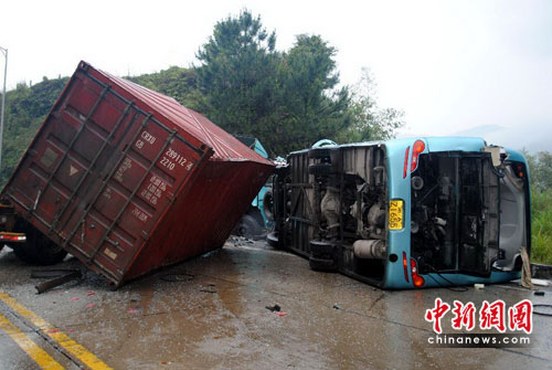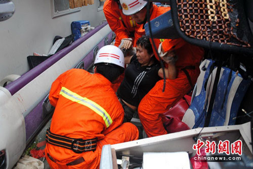 到场后,只见事故现场一片狼籍,油污、破碎的玻璃和乘客的行李满地都是,有几名先行获救出来的乘客正或躺或坐在路边痛苦地呻吟。前方不远处,一辆货运挂车横停在路上占据了半个车道,后背拖挂的集装箱也已脱离了车体倒在一旁;而事故中巴车就侧翻在货运挂车脱离的集装箱旁,车体中部正对在路旁的一条排水沟上。其中一名被困人员由于车辆侧翻,摔入了路边的排水沟内,正被中巴车内的座椅死死压在身上不得动弹。由于此刻正下着大雨,排水沟内满是积水,只见被困人员拼命抬高头部,伸长脖子,以不让积水淹没。