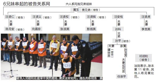 汪氏兄弟组织的卖淫团伙昨天栽了,团伙11名成员在南岸法院分别领刑6年到14年半不等的刑期,11人共处罚金1388.4万元。该团伙成员几乎全部由兄弟姐妹以及其伴侣、亲戚组成,分别控制卖淫妇女多达数十人,业务涵盖广东广州、东莞以及重庆的南岸、渝北等地。为发展业务,该团伙有专人放哨,配有专车接送卖淫女,租住房间安置遥控报警器、高空逃生绳等设备,逃避警察打击。