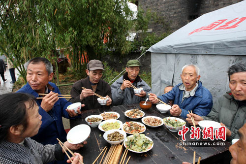 7日中午,记者在重庆垫江县沙坪镇李白村一灾民安置点看到,8名受灾群众正吃着热气腾腾的饭菜。“自家房屋在5日晚被风暴雨吹跨后,今天是在灾后第一次吃上了热饭菜。”一郑姓村民告诉记者,除能吃上热腾腾的饭菜外,他们的安置帐篷也已搭建完毕。