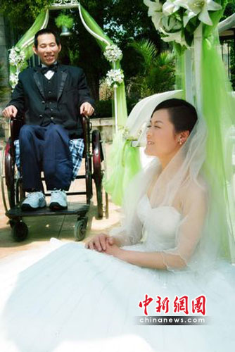 中新网徐州5月7日电 (记者 邵国栋 董敏)拍摄一套婚纱照对结婚新人是一件再普通不过的事了,但是对于江苏铜山县大彭镇34岁高位截瘫的范进来说,却是一件不可能做到的事情。为了帮这对特殊的新人圆梦,徐州市众多影楼纷纷伸出爱心之手,愿意为他们免费拍摄婚纱照。6日下午,在徐州市新新娘婚纱影楼大厅,记者见到了范进和他的妻子李美玲。“自从瘫痪后就没想过结婚一事,更别说拍婚纱照了!”范进这样对记者说。