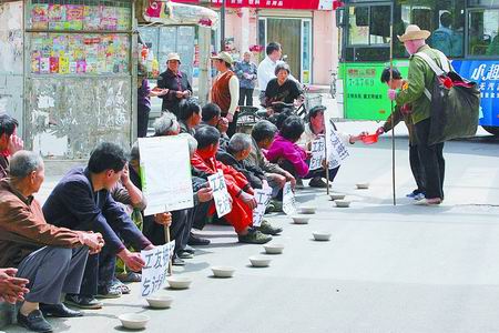 昨日上午,东风路省中医院门前,30名农民工手持瓷碗,在路边排成一行乞讨,不少市民出于同情,为农民工留下一些零钱。