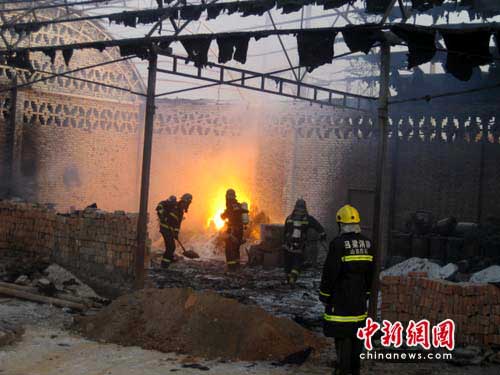 消防人员立即拉起警戒线,疏散围观群众,以防火场内氧气罐等危险物品发生爆炸,造成人员伤亡。只见两名消防人员配戴空呼后进入火场将氧气罐抬出,由于金属镁的特殊性,不能用水、泡沫等灭火剂进行扑救,消防人员果断采取沙土掩埋覆盖窒息灭火法。消防人员调来挖掘机运来沙土进行覆盖,但由于挖掘机无法进入火场,只好将沙土堆放在火场附近,消防人员利用铁锹进入火场进行覆盖灭火,经过1个多小时的紧张扑救,火灾被成功扑灭。