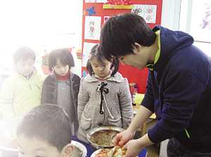 早上8点到校,照顾孩子们吃早饭,上课,课间带孩子游戏,中午和孩子吃在一块,午间陪伴他们入睡,下午4点半,挨个把孩子送到家长手中。这就是南京月牙湖幼儿园男教师朱勇一天的工作安排。他目前担任一个班的班主任,7个小时分分秒秒与孩子在一块。“累肯定累,但我很开心,我喜欢这份工作。”朱勇自信地说,男老师带孩子有优势。比如孩子见到女老师会撒娇,看到男老师一般都很乖。“毕竟男老师有一种魄力,但他们也不怕我,和我玩起来疯得很。”朱勇说,和女老师相比,他的上课风格也不一样,他喜欢和孩子一块玩,比如说在游戏中教孩子英语,和孩子一起踢球、做户外游戏,孩子们都很喜欢他。“如果真正喜欢孩子、有耐心,男生学幼教专业没什么不可以。”朱勇已经在月牙湖幼儿园待了近四年,“我很希望更多男老师加入幼教队伍中,如果待遇再提高一点,肯定会吸引更多男老师。”朱勇说。(记者 蔡蕴琦)