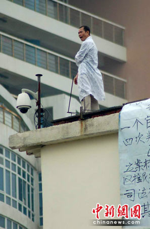 记者11时许赶至现场时,这名身穿白大褂的男子站在广西区党委对面的小区楼顶上,脚下挂出“一个官司十三年”等字样的横幅。楼顶并无栏杆,男子踱步在楼顶边缘,不时高声喊出一些口号,引得不少路人驻足围观拍照。