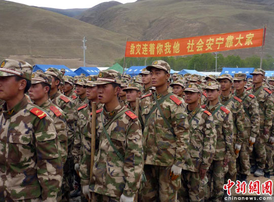 中新网玉树5月20日电 (刘洪星)随着玉树灾区重建工作的陆续开展,为确保灾后重建任务及时、高效、圆满的完成。5月中旬,武警青海省总队第四支队1200余名官兵在玉树灾区赛马场的废墟上集结,举行“突击废墟,誓保灾区重建任务圆满完成”誓师大会。