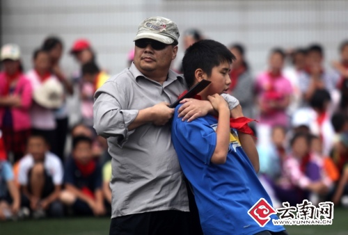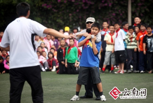 5月25日上午,昆明市盘龙区新迎第一小学足球场中,六年级1班的学生在一名男老师的带领下正在做着头部运动。突然,一名戴墨镜的男子“闯”进学校并快速走到足球场,掏出菜刀,向两个小男生“砍”去……看到这里,相信大家手心都冒汗了吧,别急,这不是真的,而是昆明市公安局盘龙分局民警与学校一起演练如何应对校园突发事件。