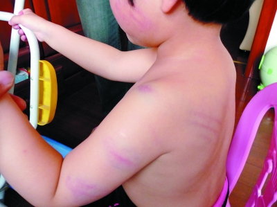 5月24日,齐齐哈尔市一位读者致电记者称,他3岁的女儿佳佳,于23日在“红缨潜能开发双语婴幼园”被老师打得遍体鳞伤。接到电话,记者马上赶到受伤女孩的家。孩子的爸爸于先生把蜷缩在墙角的佳佳抱了出来。记者看到佳佳的左脸仍然红肿。于先生脱下佳佳的衣裤,孩子的肩膀、后背和小屁股上遍布着淤青的块状、条状伤痕。佳佳此时显得很害怕,一个劲儿地往妈妈身后躲,就是不开口说话。